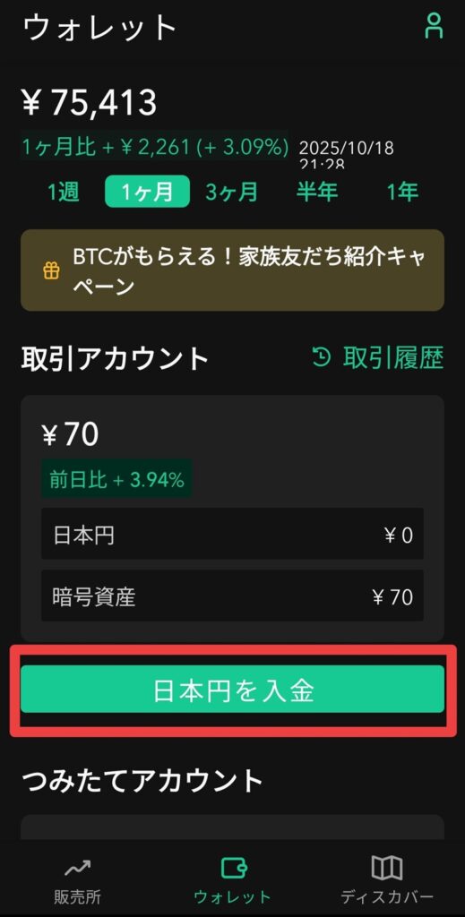 アプリを開いたら、メインから「ウォレット」→「日本円を入金」の項目を選びます。