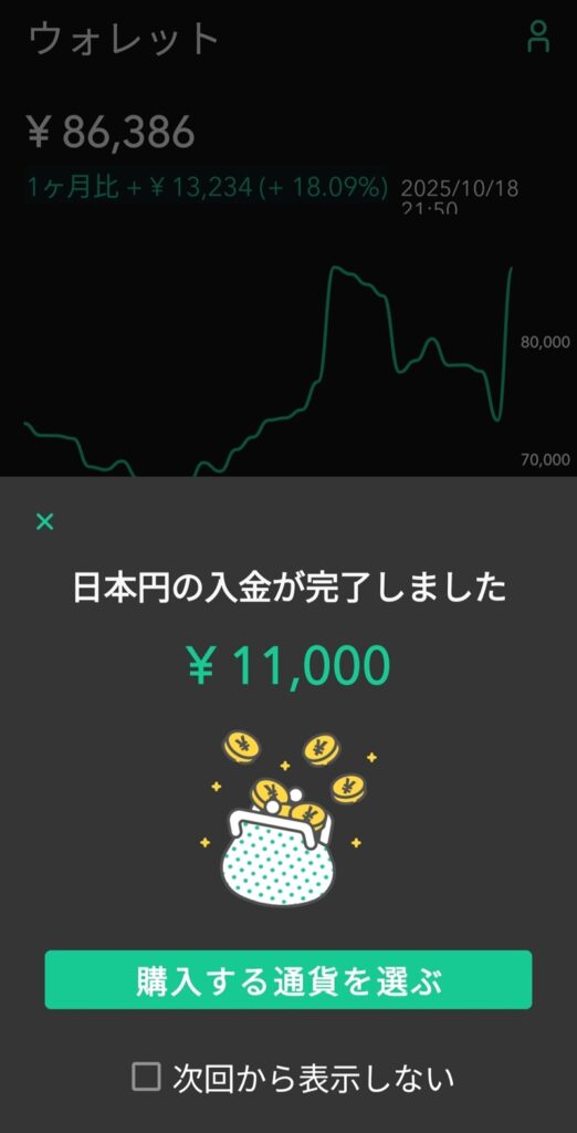 振込が完了した後、Coincheckの「ウォレット」画面で残高が増えていれば成功です。通常、数分〜数十分で反映されます。