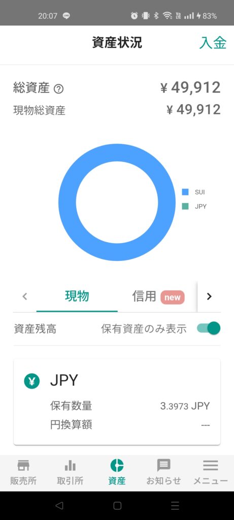 - アプリの「資産」ページに戻り、SUIの残高が追加されているか確認します。