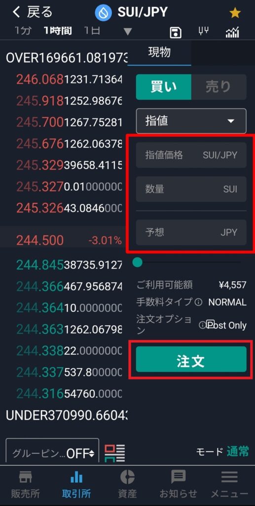- 指値価格に購入希望金額を入力。今回は「244SUI/JPY」